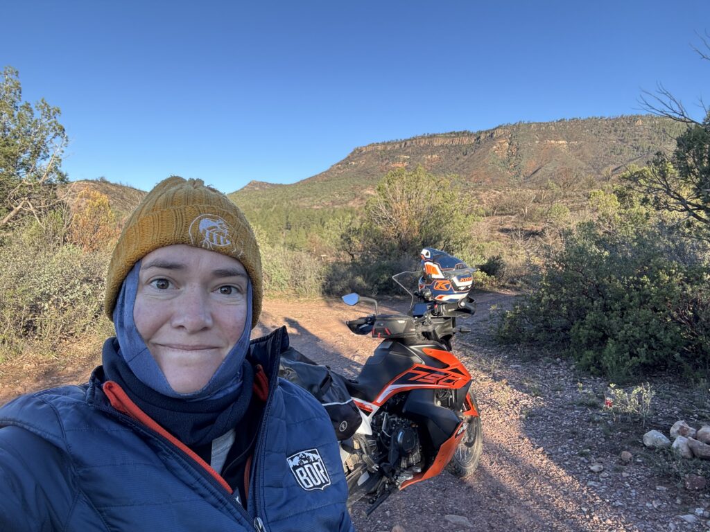 Where are you planning on riding this season? Let us make it happen for you with our helmet and luggage rentals (locking hard panniers or various soft bags) that make traveling to rent our motorcycles easy-peasy- you won’t have to haul a bunch of luggage! I am planning a Monument Valley trip shortly, a White Mountains ride to the famous “Devil’s Highway” in eastern Arizona, which used to be highway 666 but is now highway 191 featuring 150 miles of daring mountain curves, a Moab trip, and once the snow melts, several Colorado trips to enjoy the mountain majesty of the Rockies. Last year, I was quite busy moving in, but did fit in a few good rides, like this cold BDR section ride where I motocamped near the Mogollon rim and woke up with frost on my tent and bike! My brother got me a battery powered heated vest from Costco. That and my heated grips came in handy this ride!